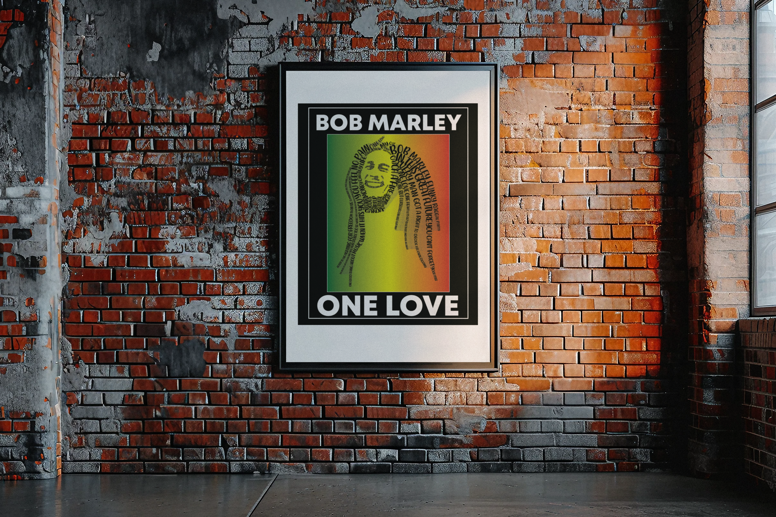 For the Bob Marley typographical portrait, we designed a visually compelling piece that not only captures the essence of the legendary musician but also pays tribute to his influence on music and culture. The portrait is crafted using a collection of Bob Marley’s iconic lyrics and quotes, meticulously arranged to form the outline of his face and signature dreadlocks. The gradient background, transitioning from green to yellow to red, reflects the vibrant colors of the Rastafarian movement, symbolizing peace, love, and unity.