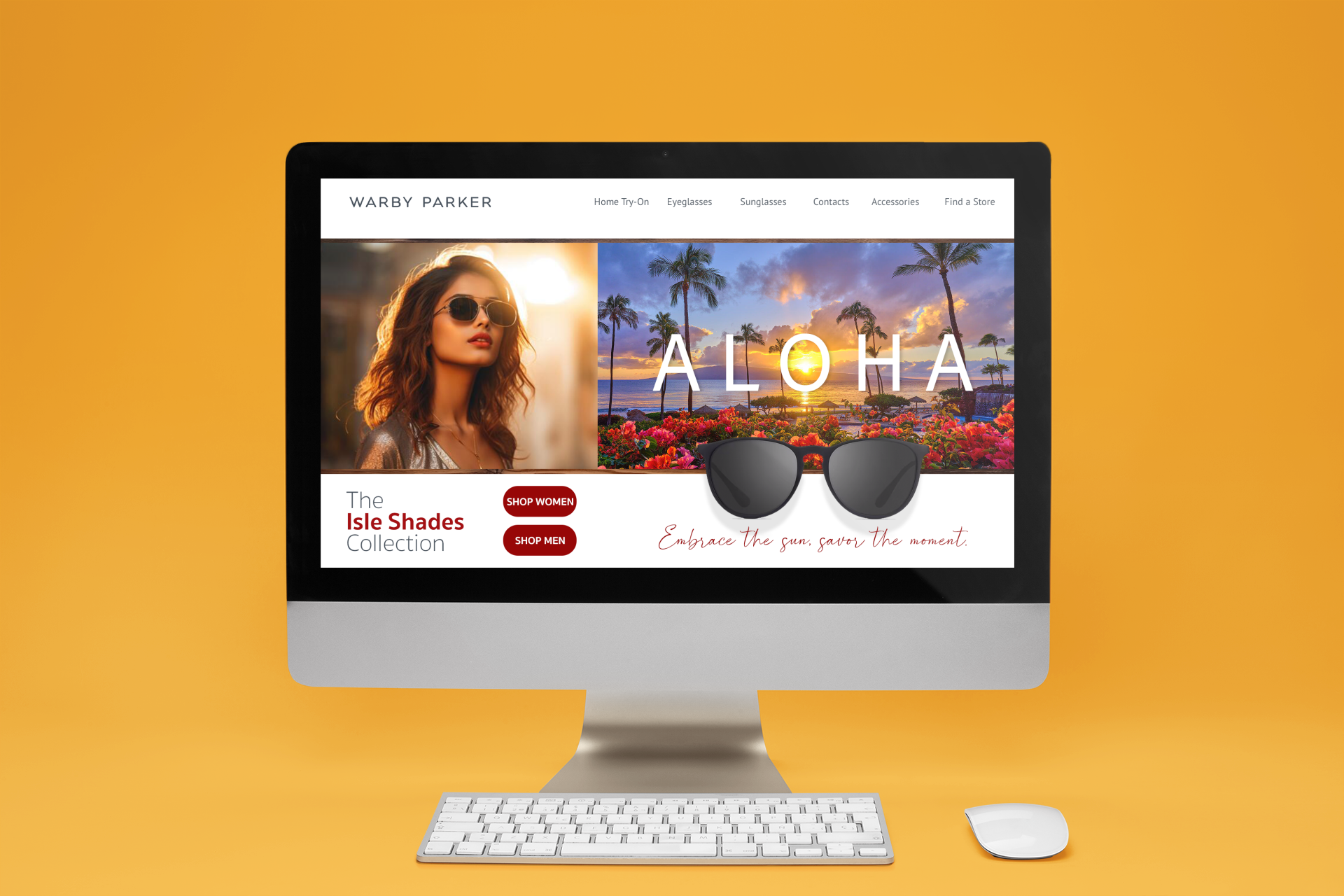 Inspired by the warm, tropical tones of Hawaii, we designed a promotional ad for Warby Parker’s “Isle Shades Collection”. The layout combines bold imagery with clean typography to evoke a sense of adventure and style. The addition of a clear call to action, along with easy navigation options to shop women’s and men’s styles, makes the design both functional and visually appealing. This campaign showcases my ability to balance brand identity with user experience while creating a visually engaging advertisement.